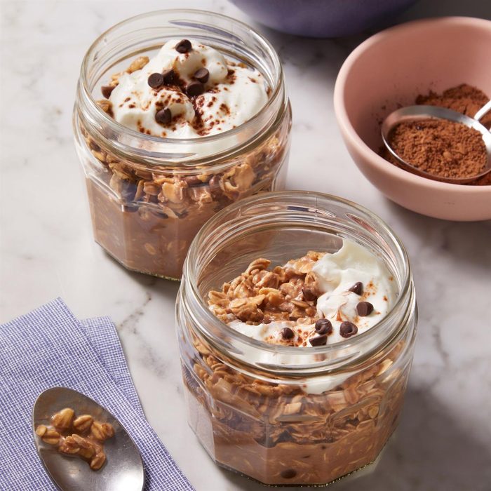 It’s almost hard to believe these decadent overnight oats are good for you. Peanut butter and chocolate? Yes! And with 10 grams of protein and 6 grams of fiber, you’ll feel full, satisfied and particularly luxurious, even if it’s just a random Tuesday.
