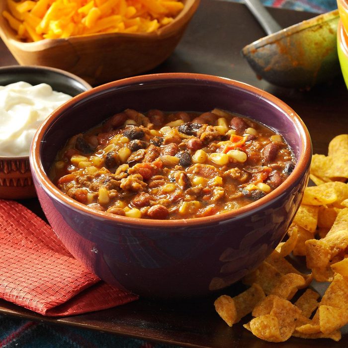 Ranch dressing mix and taco seasoning give extra special flavor to my hearty chili. Folks will come back for seconds. —Julie Neuhalfen, Glenwood, Iowa