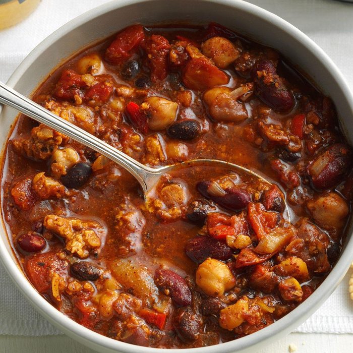 When it's cold and frosty outside, this meatless chili is sure to warm you up. It's packed with fiber, protein and flavor. Serve it with sliced avocado, or add shredded cheese, corn tortilla chips or a side of your favorite cornbread. —Liz Bellville, Tonasket, Washington