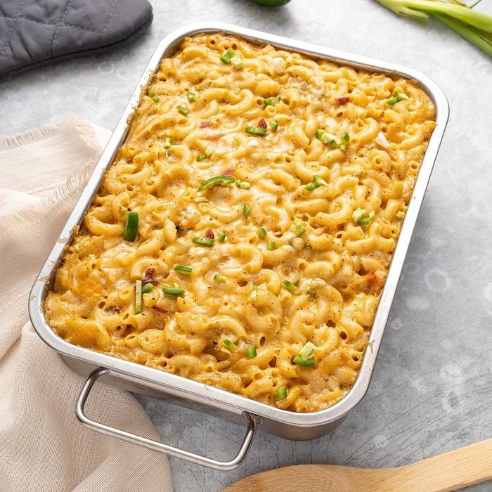 Many years ago after I had had knee surgery, a friend brought me a big casserole of mac and cheese along with the recipe. I have fiddled with the recipe over the years, most recently adding jalapenos at the request of my son. What an awesome spicy twist! —Teresa Gustafson, Elkton, Maryland