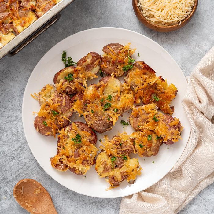 Potatoes are among our favorite side dishes. This version take sa little effort, but you can save time by boiling the spuds ahead of time. The night you want them for dinner, just crisp them up with garlic and Parmesan cheese. —Donna Gribbins, Shelbyville, Kentucky