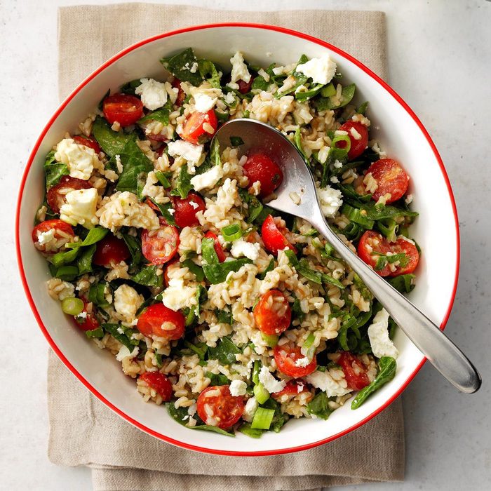 With nutty brown rice, feta and tangy garlic dressing, this Greek-inspired rice salad is excellent as a side or topped with simple proteins like grilled tuna steak or shrimp. Try to prepare this salad a few hours before eating so all the beautiful flavors have time to meld together.