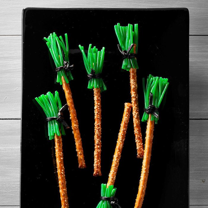 Pair these edible mini brooms with Witches’ Brew for a spellbinding combination. The only ingredients you need here are pretzel rods and licorice. —Taste of Home Test Kitchen