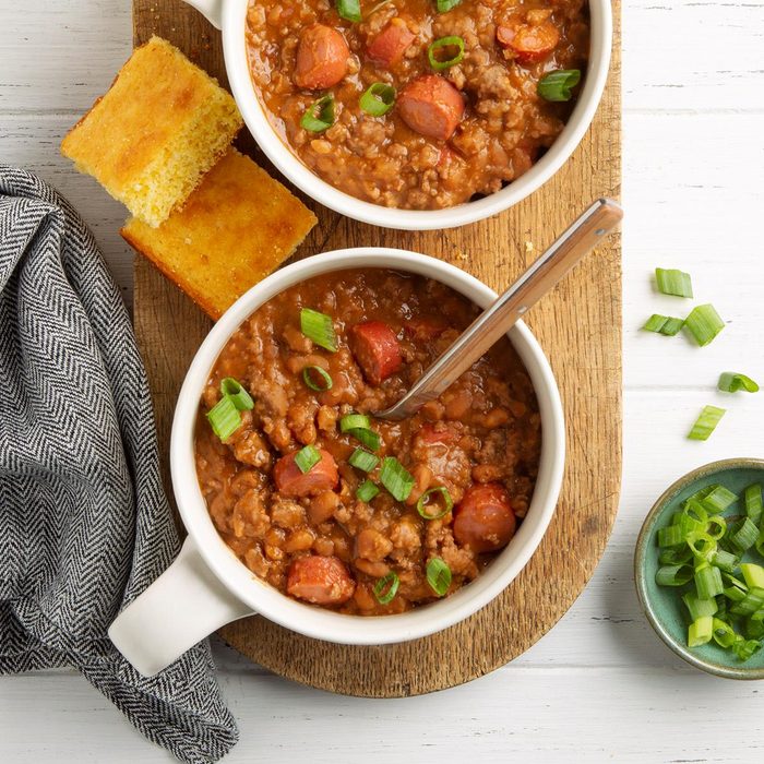 What’s not to love about a one-pot stew recipe that’s ready to serve in 30 minutes? You only need five simple ingredients to make it: ground beef, baked beans, sliced hot dogs, barbecue sauce and Parmesan cheese. Other sausages work well instead of hot dogs, so use chorizo or andouille sausage if that’s what you have on hand.