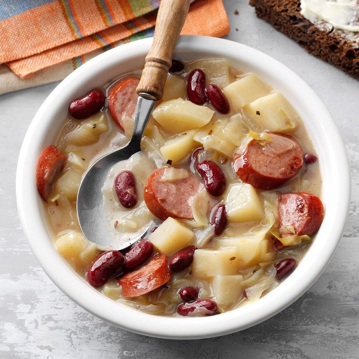 From the Recipe Creator: If you enjoy German potato salad, you'll love this stew. Caraway seeds, smoky kielbasa, tender potatoes and shredded cabbage make it a delicious, surprisingly light change of pace. —Valerie Burrows, Shelby, Michigan
