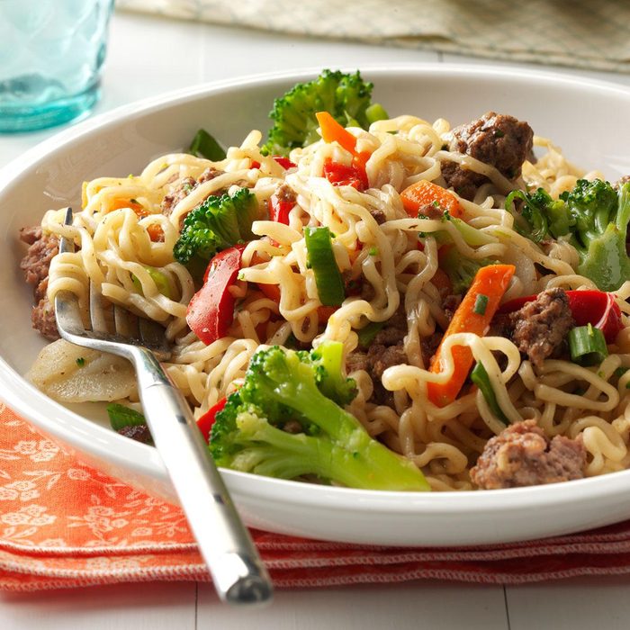 From the Recipe Creator: Here’s a quick, easy hamburger stir-fry that uses ground meat instead of the traditional beef strips. It has a nice sauce and is different enough to feel like a treat for the taste buds! —Kathi and John Horst, Westfield, New York. Next, try this dairy-free vegan stir-fry recipe.