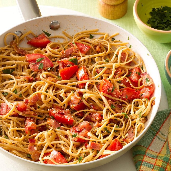This quick weeknight meal reminds me of a BLT, with its chunks of bacon and tomato. The whole wheat linguine gives the skillet dish extra flavor and texture. —Edrie O'Brien, Denver, Colorado