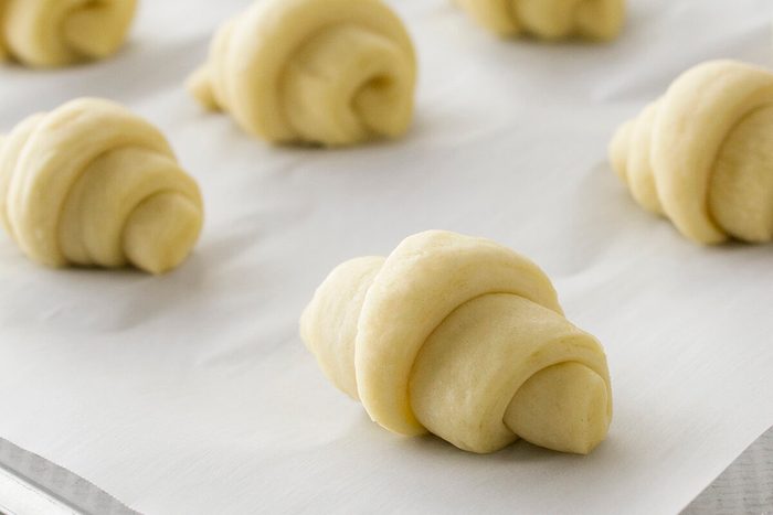 Place the rolls two inches apart on parchment paper-lined baking sheets, point side down. Curve the ends to form crescents.
