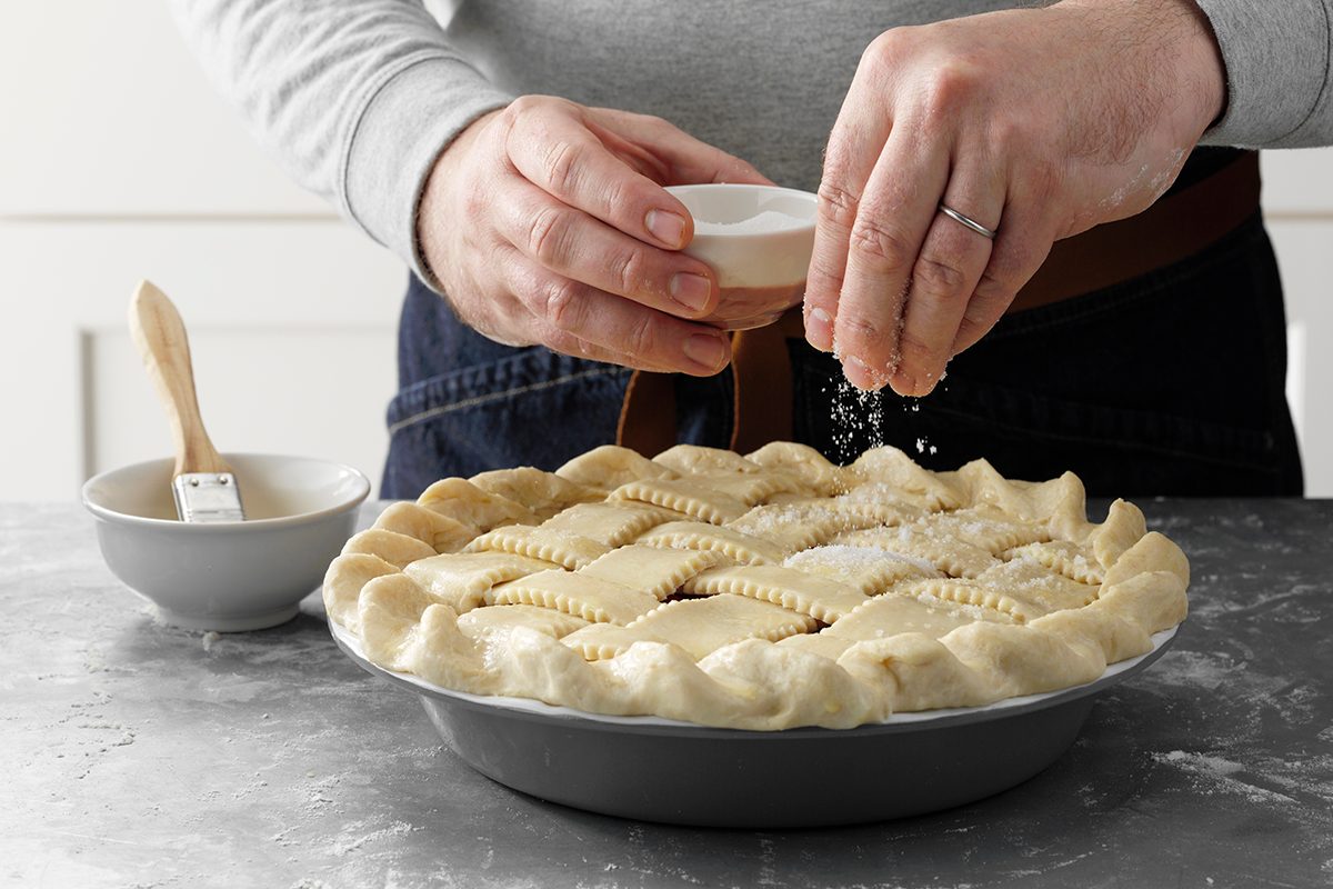Next, give the crust a quick egg wash. Whisk up an egg, and brush it over the top of the crust. For a finishing touch, sprinkle with sugar. Either granulated or sanding texture will work. That extra sprinkle will give the crust some extra crunch.