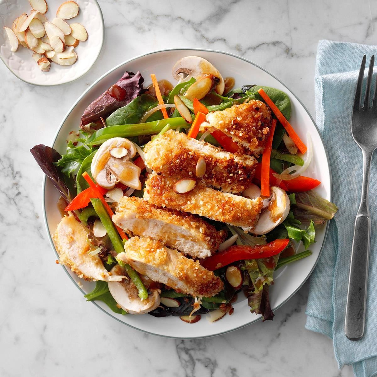 Asian flavor, crunchy almonds and crispy breaded chicken make this hearty salad something special. —Beth Dauenhauer, Pueblo, Colorado