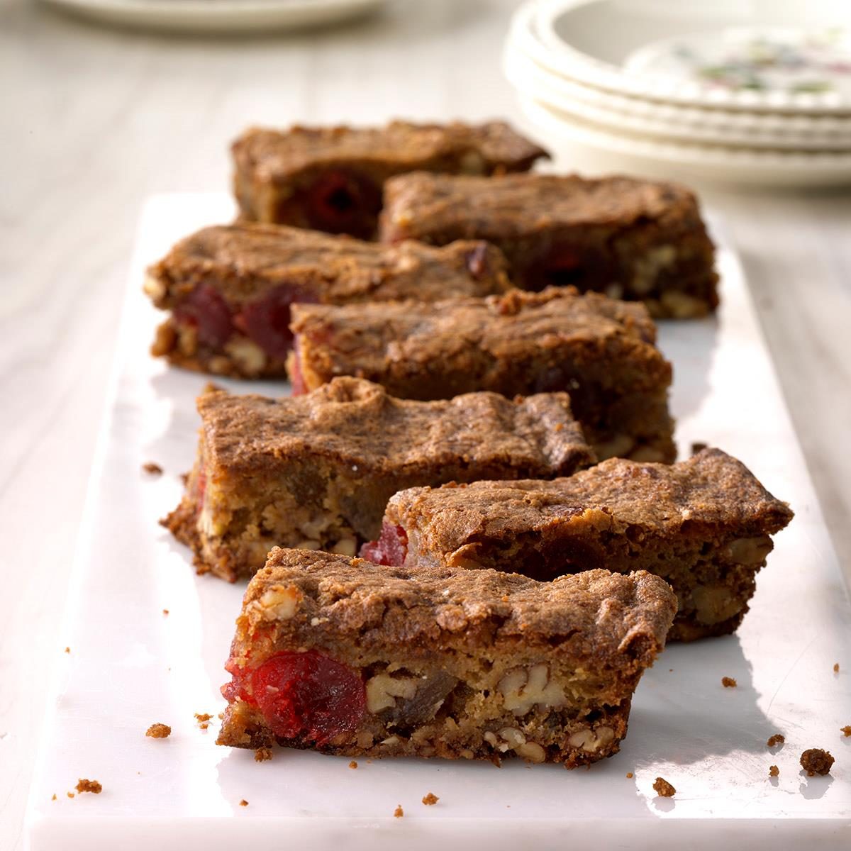 My grandmother handed down the recipe for these gooey bars that we all love. The candied cherries are a must....