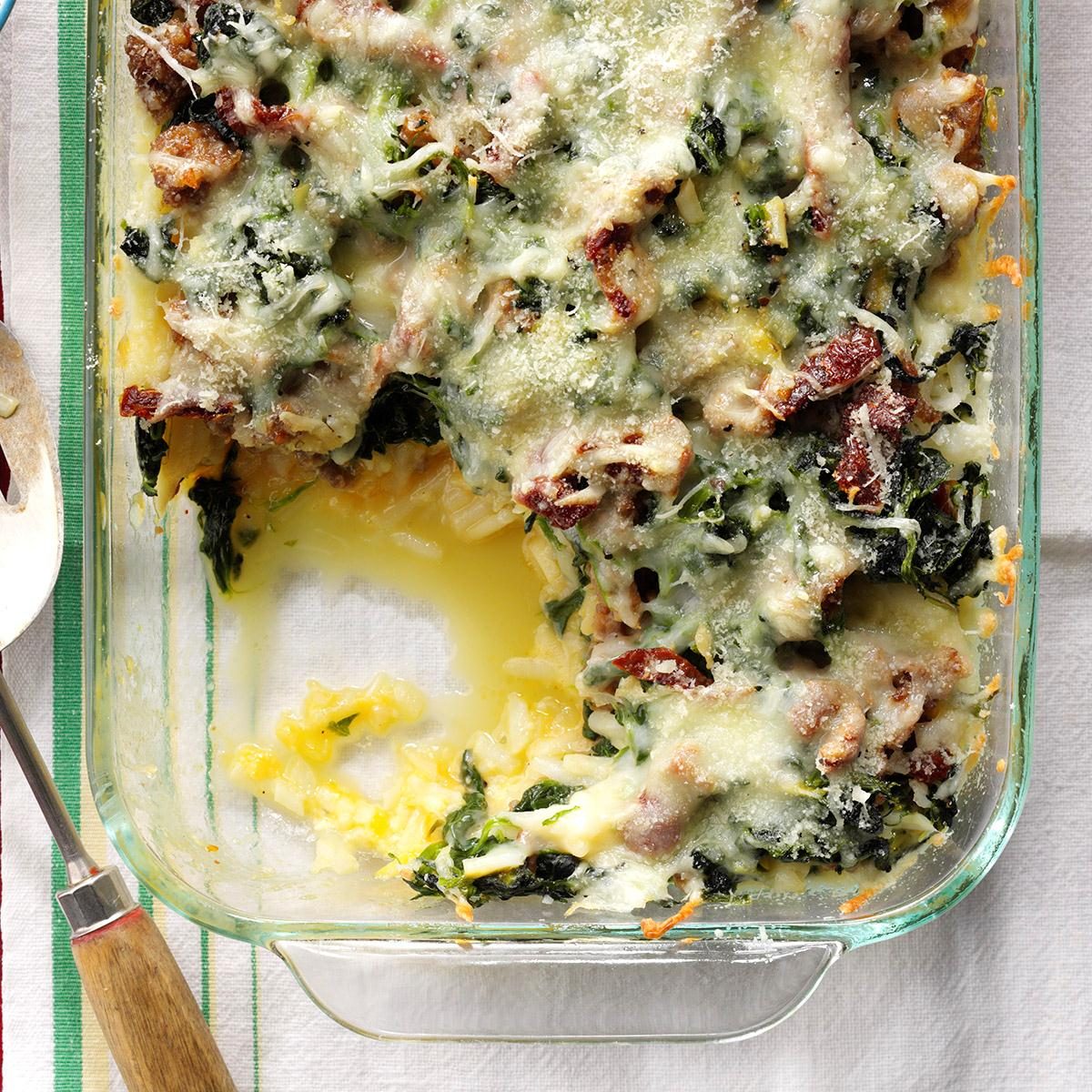 Sun-dried tomatoes and sausage add lots of texture and flavor to this gooey casserole. We've even enjoyed it reheated after...