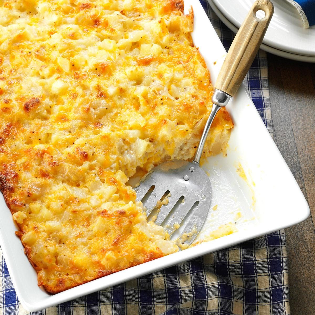 Serve up comfort food for breakfast with this cheesy casserole featuring frozen hash browns. It requires just 10 minutes of...
