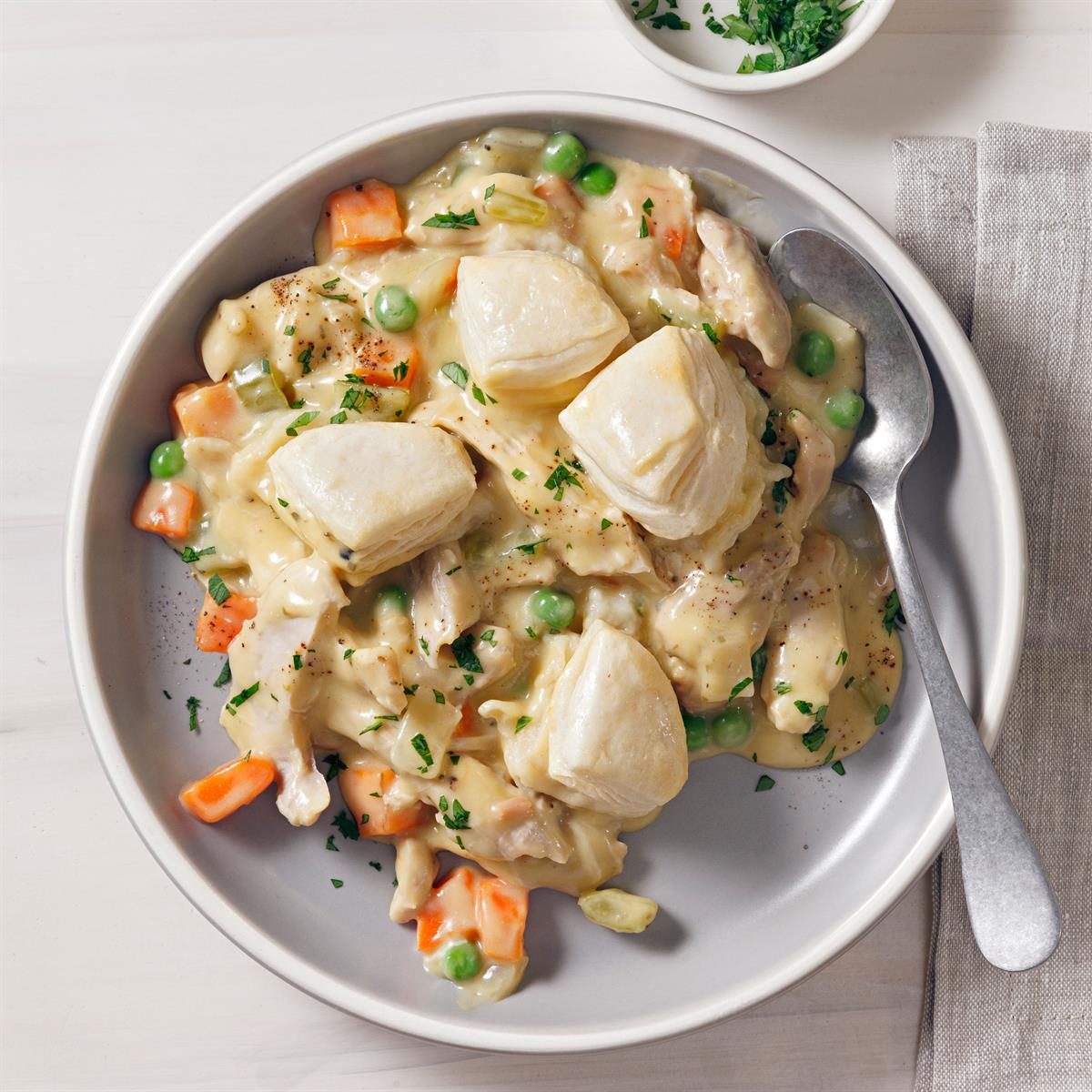 Each bowl of this easy, flavorful slow-cooker chicken potpie is topped with a fluffy biscuit.