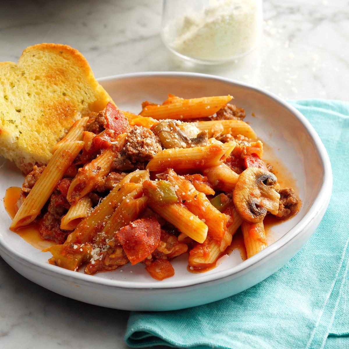 When you don’t have time to prep dough or cook in your pizza oven, make this quick and easy meat lover's pasta. If you ask me, you can top all baked pasta with pizza toppings to fill your pizza cravings anytime! —Tyler Smith, Virginia Beach, Virginia