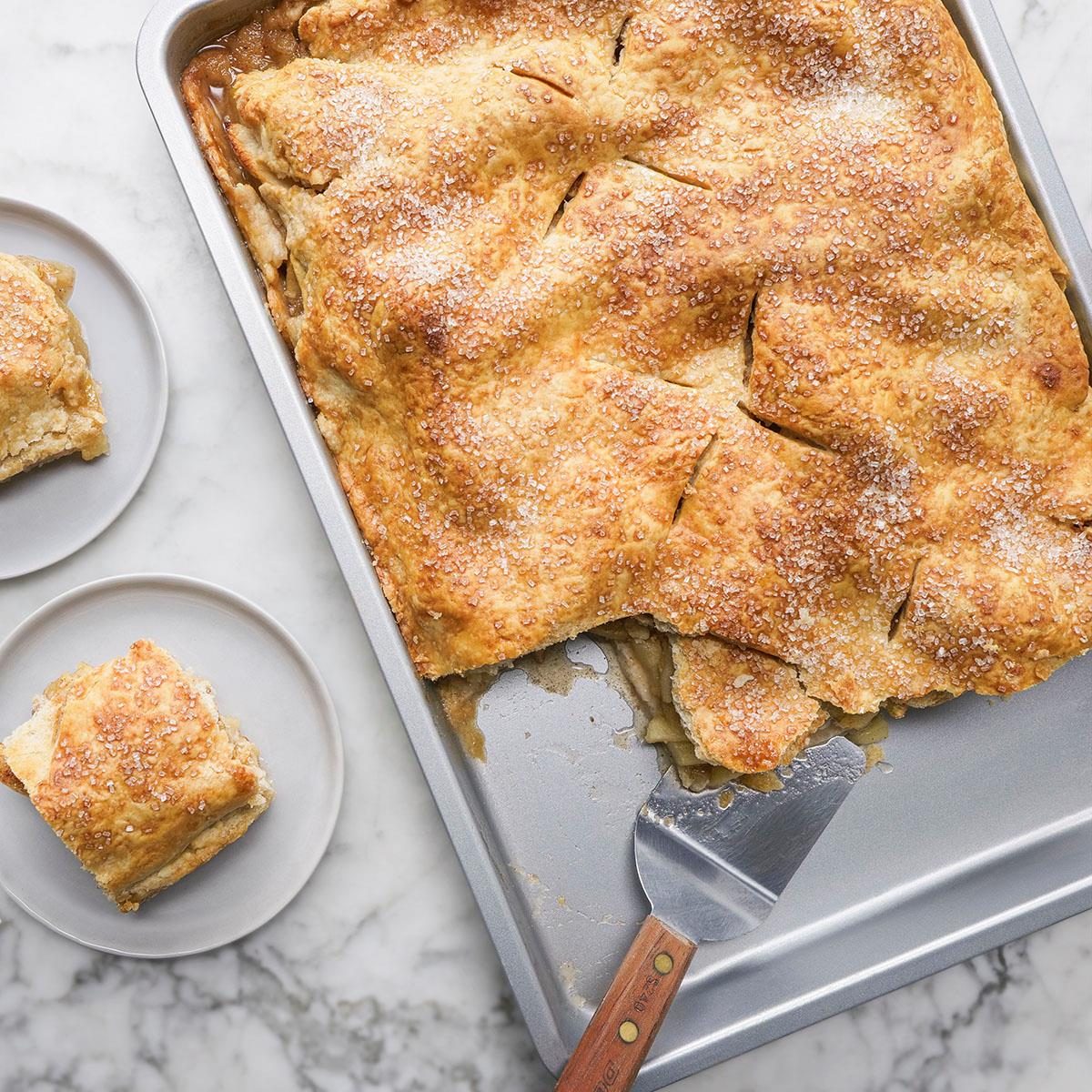 This sprawling, sheet pan-sized apple slab pie will surely be a crowd-pleaser. Thinner than a pie, it's like nibbling a...