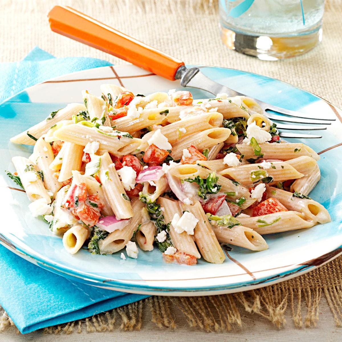 Spinach, peppers and onions mingle with tangy feta cheese in this simple pasta salad. Feel free to make it ahead...