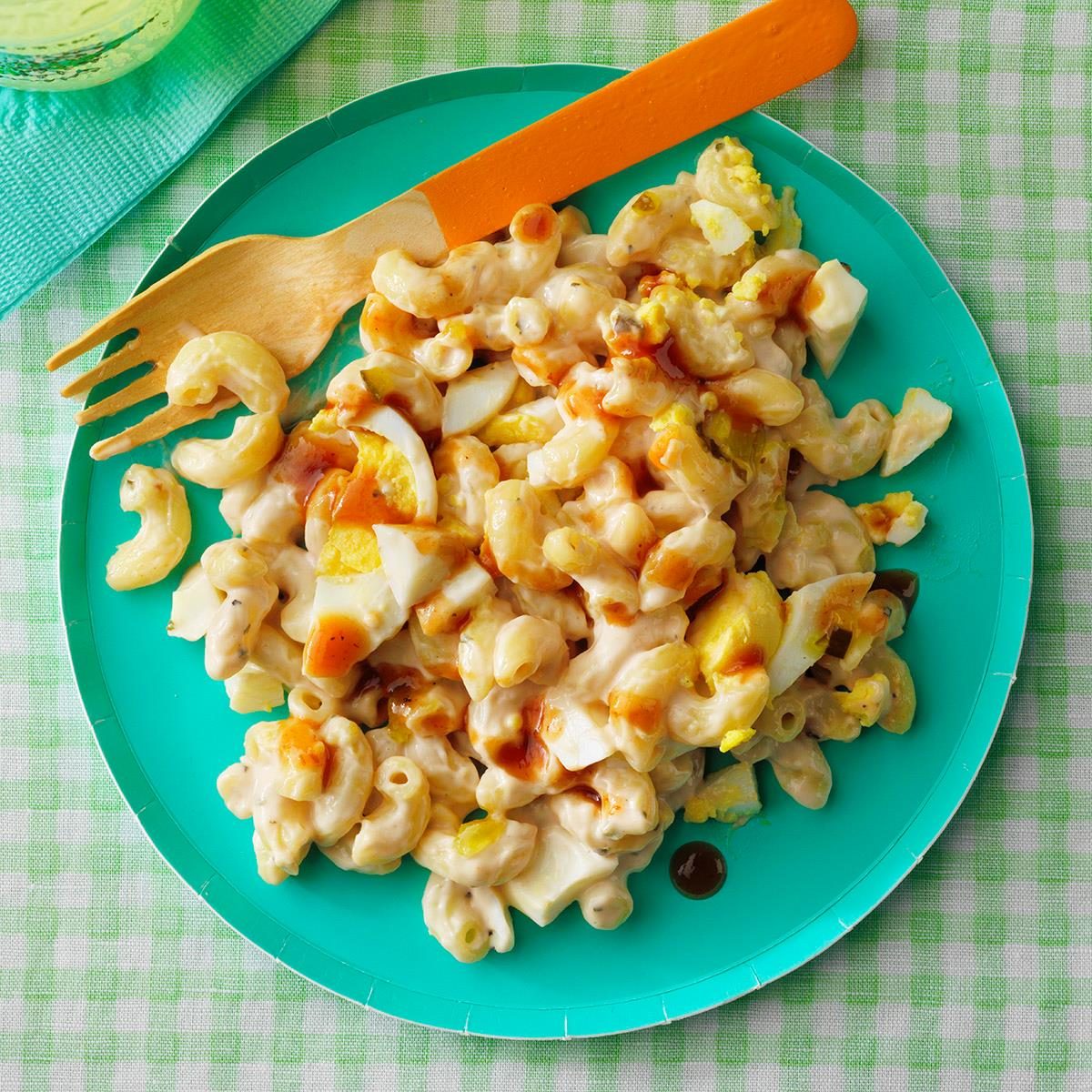 My family loves a touch of barbecue sauce and ranch dressing in our mac salad. Not too much—just a hint...