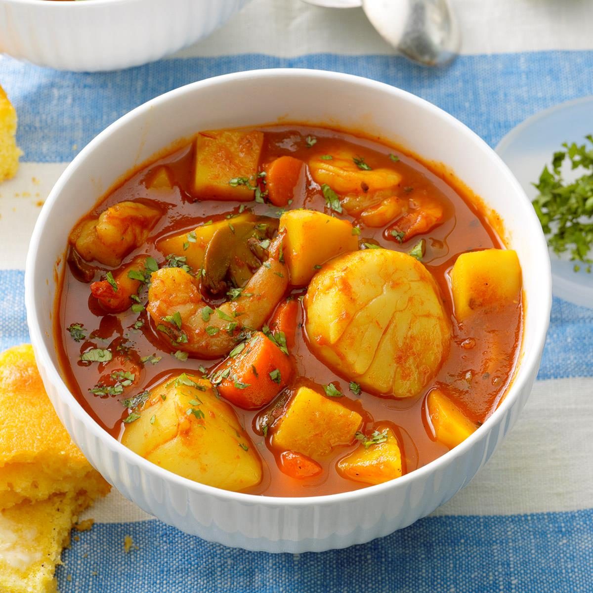 Shrimp and scallops make this thick, cheesy and chunky chowder extra special. It’s packed with veggies, and the crispy bacon makes a yummy garnish. —Taste of Home Test Kitchen