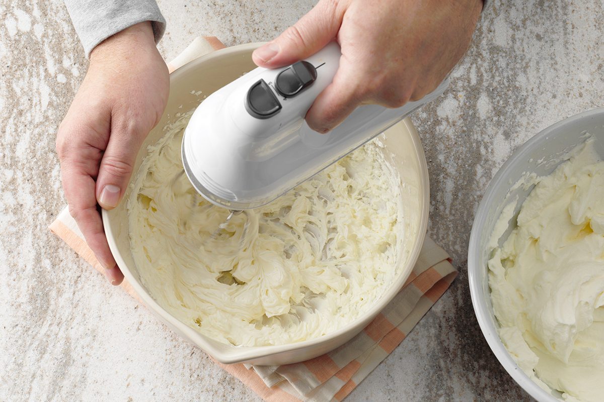 Grab another mixing bowl and mix the room temperature cream cheese until smooth. Then beat in the remaining whipped cream until combined.