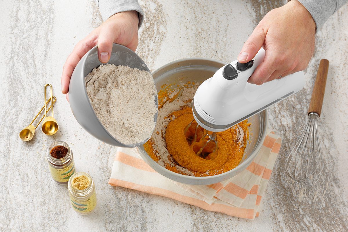 To begin, cream room temperature butter and sugar together until light and fluffy—about 5 minutes. Then use a mixer to beat in the egg and honey. Stir in the pumpkin and rum.